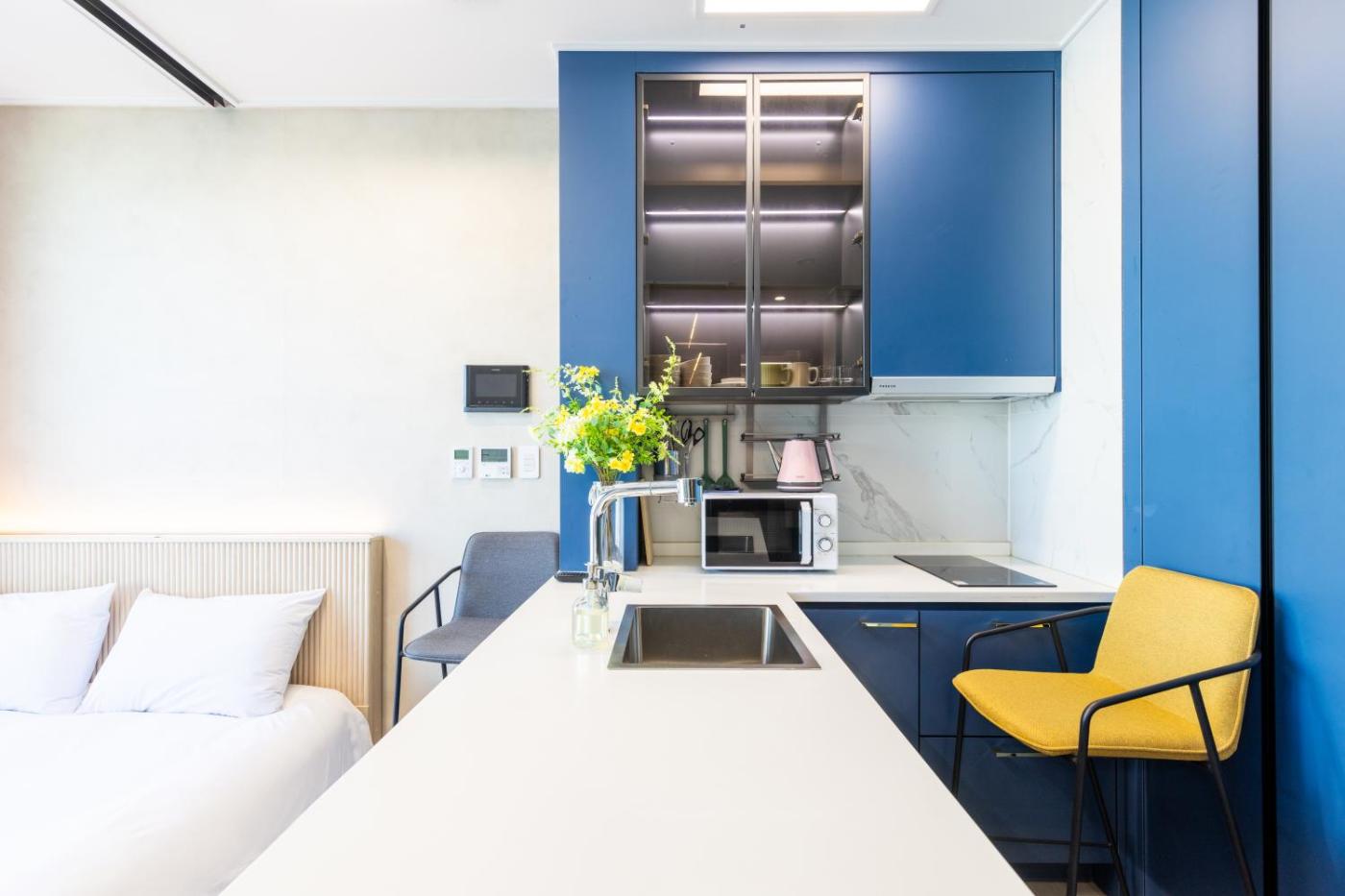 Premier Busan Tower View. Guests will have a special experience as the apartment offers a hot tub. This apartment includes 1 living room, 1 separate bedroom and 1 bathroom with a bath and free toiletries. In the kitchen, guests will find a stovetop, a refrigerator, kitchenware and a microwave. This apartment is air-conditioned and has a seating area with a flat-screen TV, a washing machine, soundproof walls, a dining area, as well as a wardrobe. The unit has 1 bed and 2 futons.