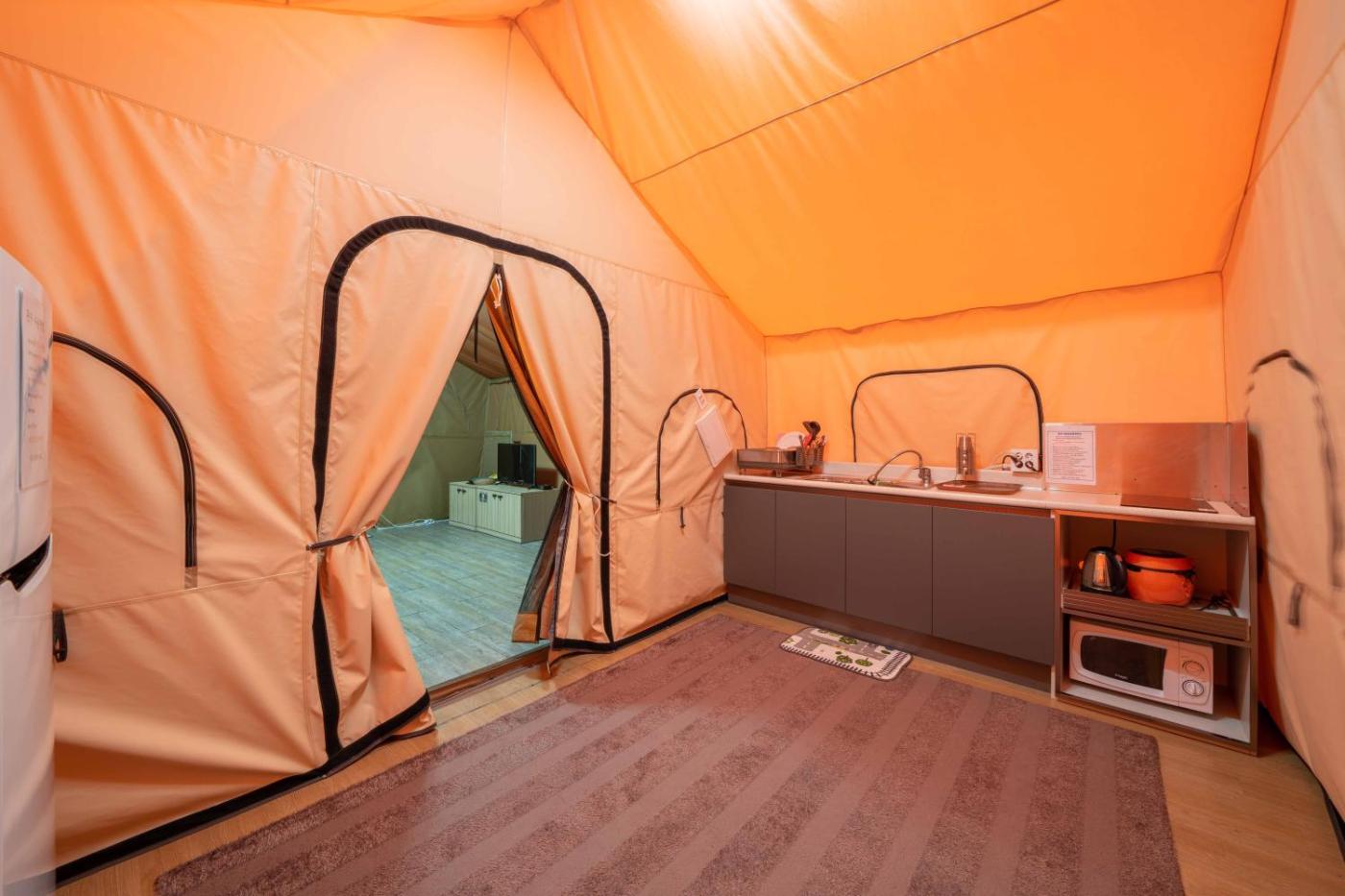 Tent. The tent features air conditioning, an electric kettle, as well as a private bathroom boasting a hairdryer. This tent provides a sofa and a TV. The unit has 1 bed. ;